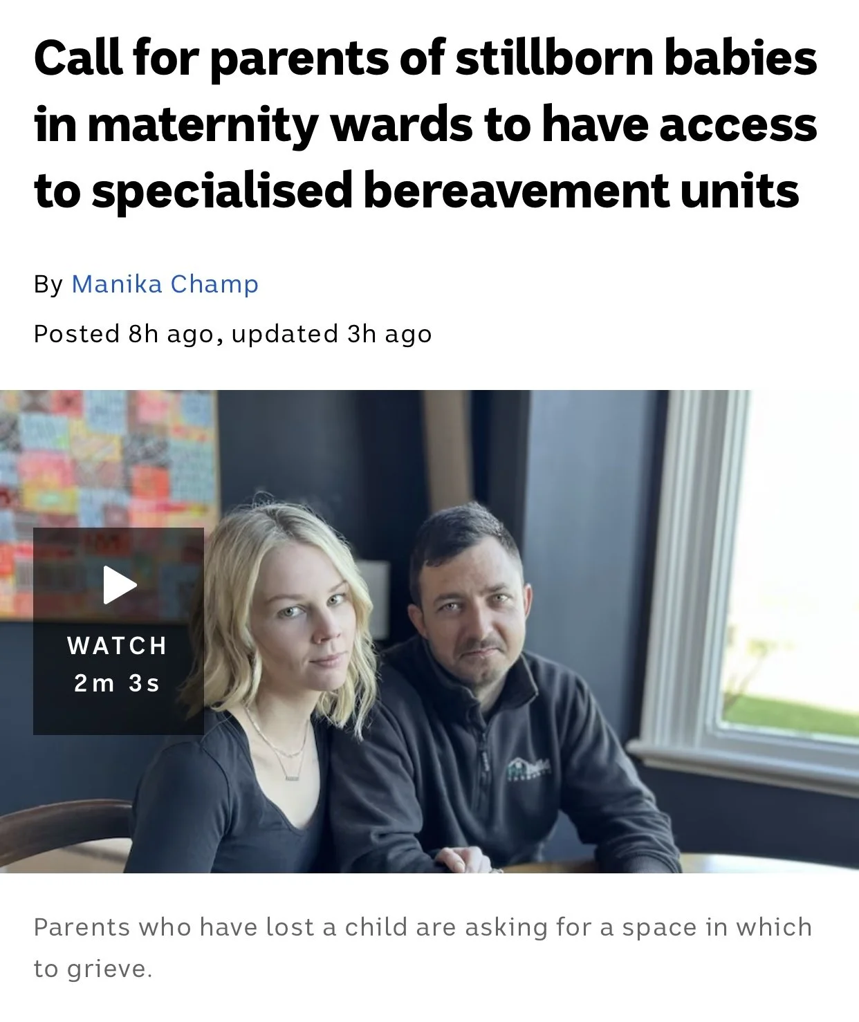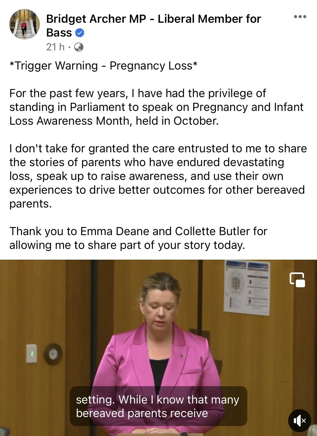 Media & Events ABC Northern Tasmania Article 7 News - The Latest Remembering Amelia; lost, but still a birth ABC August 2023 Examiner Feature Sep 2023 Bridget Archer - Pregnancy & Infant Loss Awareness Month Parliament Speech 'Bittersweet': Launceston mum launches charity in daughter's memory
